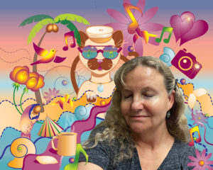When thinking of the theme of “Color of Music, Rhythm of Art”, I decided to create a fused glass piece. I see color as a bright, happy experience or a thoughtful, moody interpretation. I enjoy listening to music as I create my artwork. I started with the black glass powder method of sgraffito and then added bright orange, teal, and lime green. I portrayed a mixture of classical, folk, and upbeat 70’s classics, my favorite genres of music. This fused glass abstraction piece expresses what I feel when I listen to music. We can be transported to a different time or place, move to the beat, and just enjoy the sound. Art and Music add so much to our lives, I know I would not be able to live in a silent blank world.