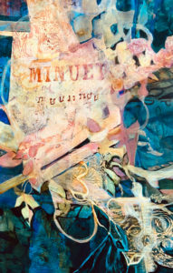 I listened to “Minuet in B Major” at times while working through this art work. I felt the lyrical strokes of the instruments, then in between, the soft warm spaces, again beautiful notes creating music. It affected my hand holding a brush as if it took up the dance of color and sound. I finished this expression with great joy!