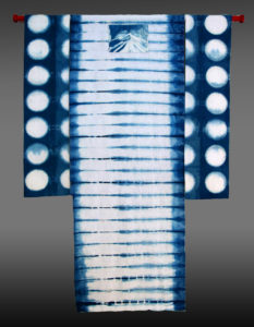 Indigo is the traditional dye used in the art of shibori. A rhythm is created by the folded and dyed fabric.