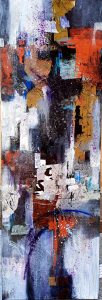 Artist, Julia Noyes, was inspired by listening to a musician living in Lincoln, Nebraska, for almost two years. The musician is from South Korea would often practice her violin in the Noyes art studio while Julia painted. The musician, Lyla Yeeun Cho, concert master violinist, became like a daughter to the artist. This relationship included Julia going to South Korea to meet Lyla’s parents. Lyla gave Julia some of the Asian motif papers incorporated in this collage and for use in other abstract paintings. Most of the music Lyla played was classical in nature, indeed difficult, complex, moving, and emotional. Imagine how this live interaction with music became interwoven into Julia’s paintings.