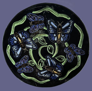 When thinking about the theme of “Pollinators,” I aimed to create a unique style of hand-built pottery. I started the process by rolling a lump of clay into a slab and then pressing it into the shape of a large open bowl. After adding a foot to the bowl and smoothing the edges, I began carving, which I found both satisfying and thought-provoking. Next, I used underglaze to paint vibrant colors that depicted butterflies among green summer leaves. My goal was to capture the warmth of a sunny day and the joy of butterflies flitting about in a garden. The butterflies surround the leaves, symbolizing their role in pollinating the vegetation, while bringing a sense of happiness to the viewer. The title also brings to mind the idea of our world going ‘round and round’ through the years and life being sustained with the help of pollinators.