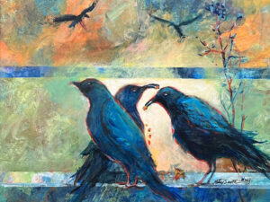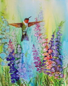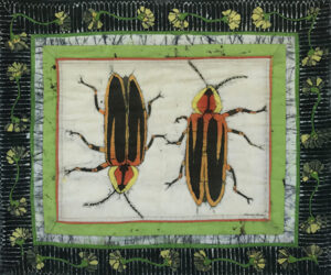 I chose to paint the theme of lighting bugs at night, emitting a florescent color, because not many people know they are pollinators. The lighting bug is from the Lampyridae family, comprising over two thousand types of beetles. I hope that “Firefly Magic” evokes in you that feeling of childhood wonder that I felt when I saw fireflies at dusk.