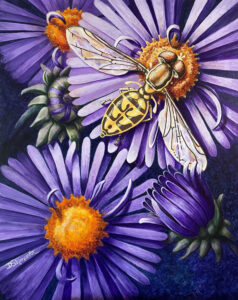 The calligrapher fly is one such pollinator – known as a bee and wasp “mimic.” It looks similar to bees with black and yellow coloring, giving it protection from predators, but this “flower fly” does not sting. One easy way to identify the small calligrapher fly species shown here, is by the dot near the vent end of its back. It pollinates by going from flower to flower, eating and exchanging pollen grains like bees, but without amassing pollen on its legs like bees do. Calligrapher fly larvae feed on aphids and other plant pests, making them incredibly valuable at every stage of their lives.