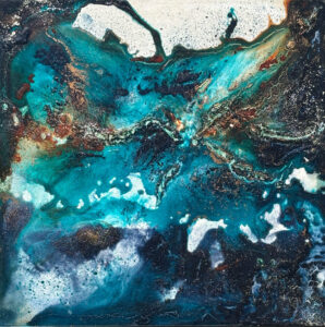 I have been a student of watching water for many years. Playing in it as a kid, jumping waves and swimming in it, then watching it tumble over rocks, in streams, snuggling in and around stones in creeks and rivers. It has taken me a long time to be able to interpret it into paint, the flow of it, the transparency of it, and coolness of it running over hands. It can hypnotize one who sits quietly and watches it pass by. It can nurture us in a way that other elements can not.