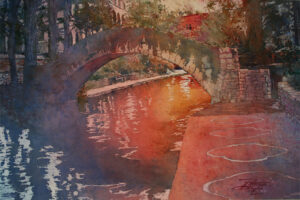 On a bend in the San Antonio River, this scene was bathed in beautiful evening light in colors of the sunset. Surrounded by lush plants and picturesque buildings, the bridge emerged with its patina of weathered stone and algae. It was a magical moment—one I knew I had to paint.