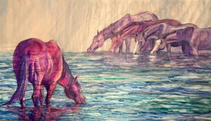 Like humans, around 75% of a horse's body weight is water, which translates to 95 gallons for an average adult horse. Mustangs, like those I used as models, are often relegated to the roughest and driest parts of federal land, but fortunately, this herd has access to a creek that runs through their territory.